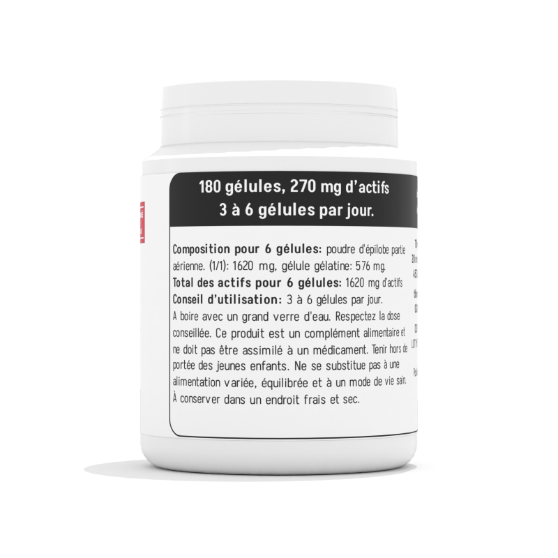 Composition pour 60 ou 180 gélules: Poudre d'Epilobe : 270 mg, gélule végétale.